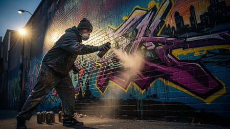 Graffiti artist spraying aerosol paint on a wall in an urban environment