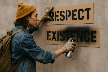 Young activist uses spray paint to create a powerful message on a wall, promoting respect and existence through street art