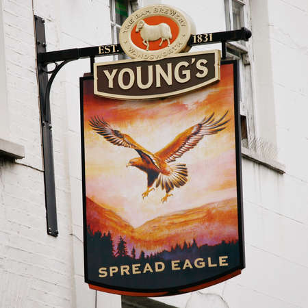 London, UK - June 17, 2012: English pub sign, Public house, known as pub, is focal point of community. Pub business, now about 53,500 pubs in UK, has been declining every year.