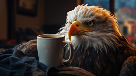 Eagle with a cup of coffee on the background of the window