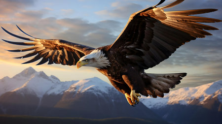 Eagle in flight with outstretched wings against snowy mountains and sunset sky
