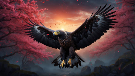 3d rendering of an eagle flying in the sky at sunset in a forest of cherry trees.