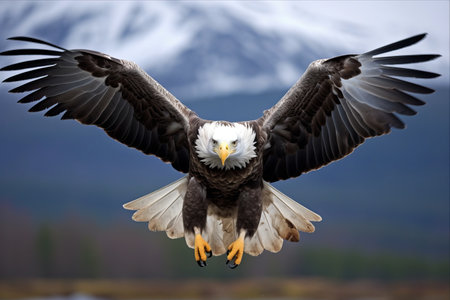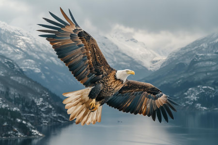 Bald eagle with outstretched wings flying gracefully above snow capped mountains under a dramatic cloudy sky. symbolizes freedom, power, and the wilderness.