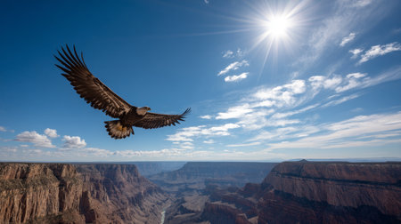 An American eagle soaring high above the Grand Canyon, vast landscape below, bright blue skies. Election Day in the USA. America Day. Festive Mood on President's Day.