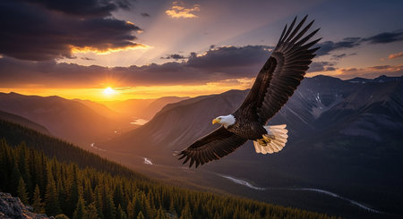 A majestic bald eagle soaring over a mountain range created with Generative AI