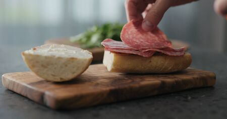 man put salami on ciabatta slice on olive board