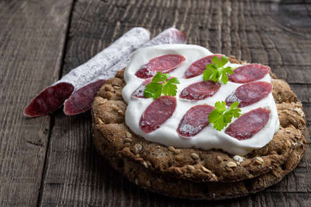 Crispbread with cream cheese and salami on wooden table