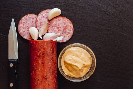 Raw salami meat with garlic cloves, a knife and mustard next to it – Sausage with slices and seasoning on black slate
