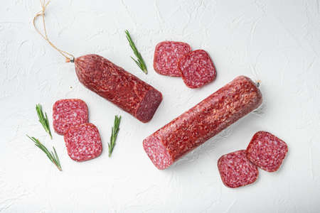 Salami, salami smoked sausage, sliced set, on white stone table background, top view flat lay