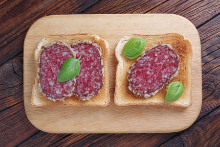 Salami sausage sandwiches on cutting board located on wooden table, top view