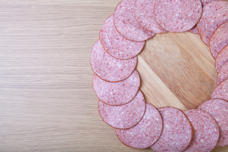 Few slices of sausage lies in the shape of ring on a light wooden table.