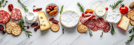 Artisanal Cheese And Charcuterie Board With Cured Meats, Dried Fruits, Crackers On A Marble Surface