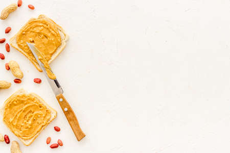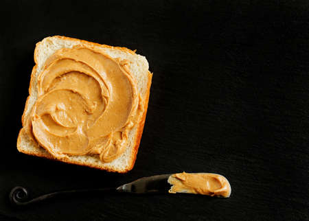 Two tasty peanut butter toasts placed on stone table. Knife on side. Top angle shot with copy space.