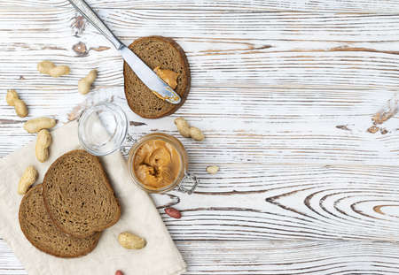 Slices of bread on a light napkin on a light wooden table. A jar of peanut butter and a sandwich in the background. Top view, space for text. Light wooden background