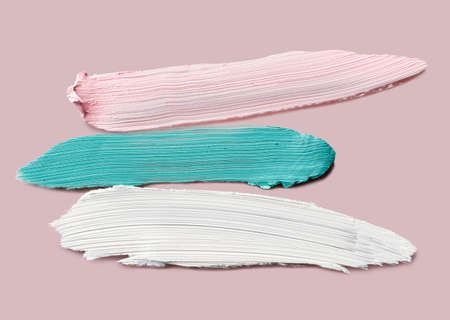 Samples of color correcting concealers Set on pink background. Swatch smears of cream makeup base