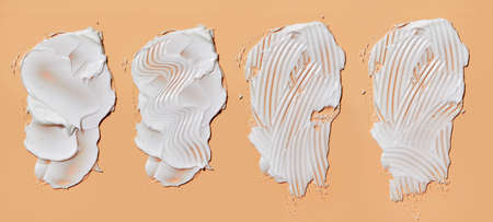 Set with different cosmetic smears on peach background. Beauty creme smear swatch. Cream, Lotion for face or body