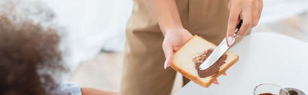 Cropped view of african american mother making toast with chocolate paste near kid, banner