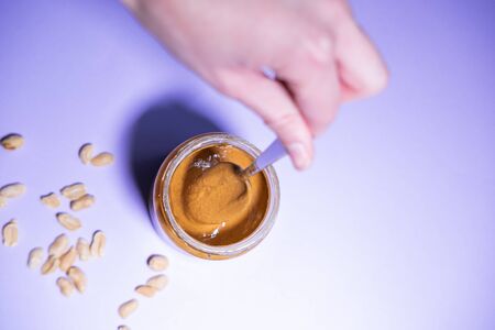Woman's hand with a spoon taking peanut butter from a glass bottle on purple background. Vegan and bio snack. Vertical picture. Top view.