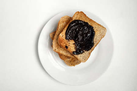 Delicious toasts with chocolate for breakfast before coffee, toasts on a white plate, dried bread on a white background.