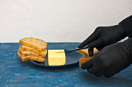 Hands of young Asian woman chef spreading butter on rustic rye bread with metal knife on wooden board on kitchen table in house. Fresh homemade bread production, Healthy eating and traditional bakery.