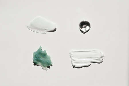 Cosmetic smears and drops. Appearance of the texture of the cream, gel and blue oil on a white background. Natural skincare products. Beauty concept for face and body care