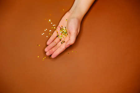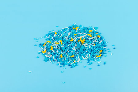 Sprinkle with grains of desserts. Sweet confetti in the form of stars, moon on blue background. Design for holiday designs, party, birthday, invitation.