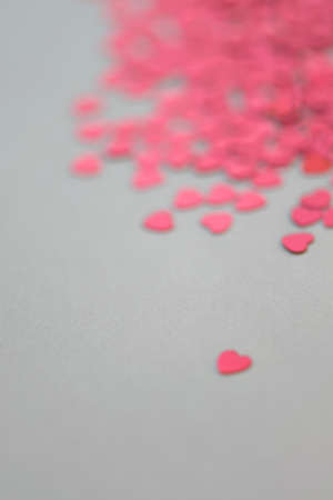 Red and pink glitter hearts on white background. Selective focus. Valentine´s Day.