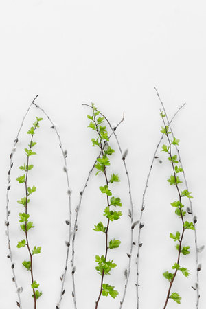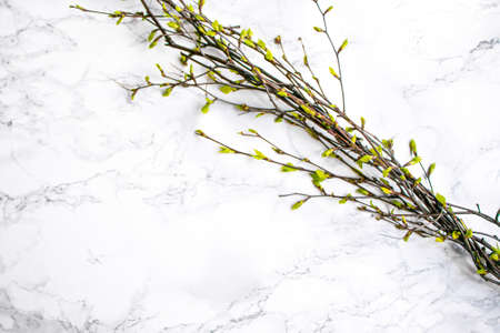 Birch branches on bright green background. Easter background. Zero Waste concept, top view, copy space