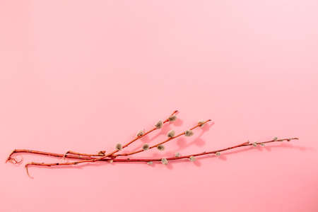 Pussy willow twigs on a pink background with copy space, empty text place. Easter greeting card. Religion spring mockup design. horizontal postcard. Gentle natural template. springtime layout.