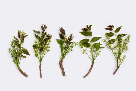 Two branches of forest plants isolated on white background. Mock up with plants and copy space. Top view, Flat lay.