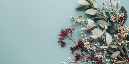 Flowers composition. Eucalyptus branches and berries on pastel blue background. Flat lay, top view, copy space