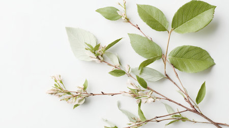 White background with several small and natural delicate leaves and spring flowers Generative AI Illustration.