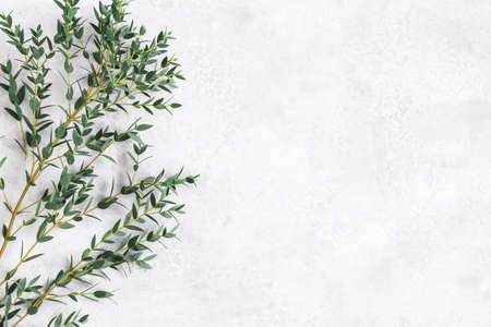 Green branches on white wooden background. Flat lay, overhead view, copy space.