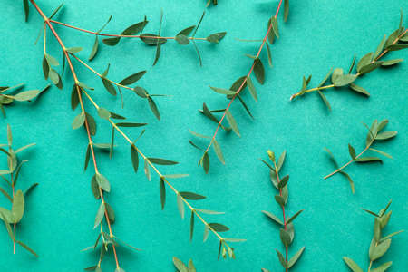 Eucalyptus leaves on concrete gray background. Frame made of eucalyptus branches. Flat lay, top view