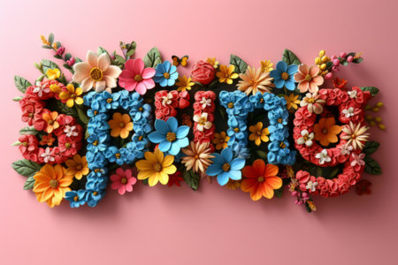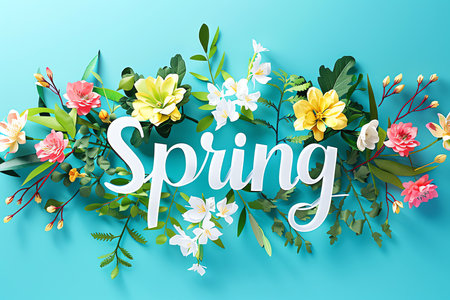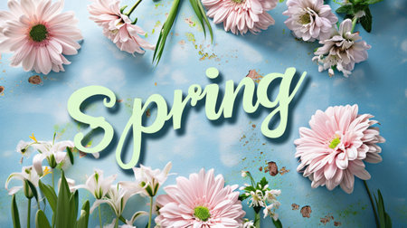 Vibrant flowers form 'SPRING' text on a textured blue surface