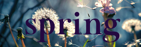 SPRING' text with flowers set in a sunny meadow scene