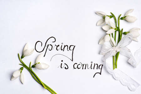 Hello spring calligraphy note with fresh snowdrops