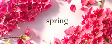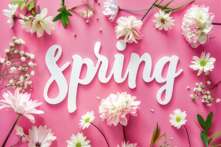 The word spring is beautifully surrounded by vibrant white flowers that sit against a lovely pink background, creating an inviting scene. AI-generated content.
