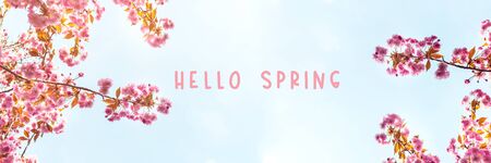 Hello Spring words. Beautiful Pink Sakura flowers, cherry blossom during springtime against blue sky, banner size