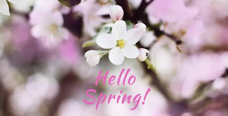 Hello spring text fresh sign. Stylish floral gretting card or poster template. Nature floral background. White Apple blossoms on a branch close-up. Live wall of flowers in a spring garden.