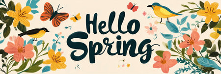 Hello Spring in vibrant typography, surrounded by bright blooms, delicate butterflies and cheerful birds, welcoming the season, banner