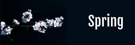 Spring has sprung text sign, trendy stylish greeting card with cherry blossom. Horizontal banner with sakura flowers of white color on blurred sunny backdrop with bokeh lights.Branch of blooming tree.