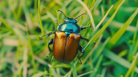 A vibrant beetle resting on lush green grass, showcasing intricate details and bright colors. Perfect for nature and wildlife themes.