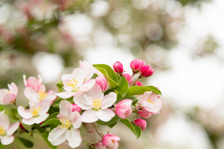 Blooming apple tree branch in spring garden with soft light and copy space. High quality photo