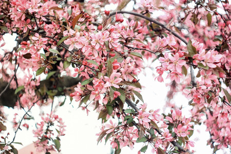 Blooming branches of Malus floribunda or Japanese flowering crab apple and sky. Spring airy background with pink flowering plants. Close-up, soft selective focus