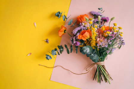 A colorful bouquet of wildflowers and greenery is artfully arranged on a surface split between bright yellow and soft pink.