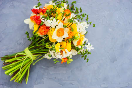 Charming variegated multicolored bouquet of spring flowers for good mood and inspiration