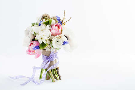 Bouquet from pink tulips, violet grape hyacinths, white anemones, violet veronica and white buttercup with violet ribbon standing on white background