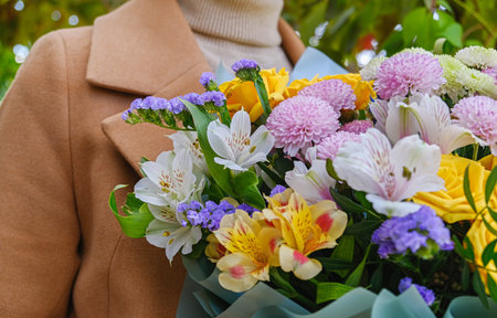 Woman in elegant coat holds a vibrant flower bouquet with yellow, pink, white and violet blooms. Perfect for celebration, congratulations, event, appreciation, greeting, spring or festive gift.