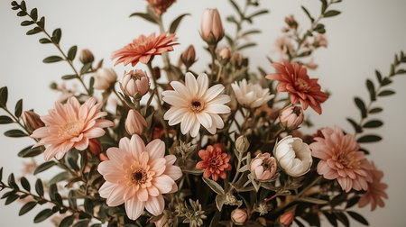 Top view of bunch of flowers, on beige background. Copy space.